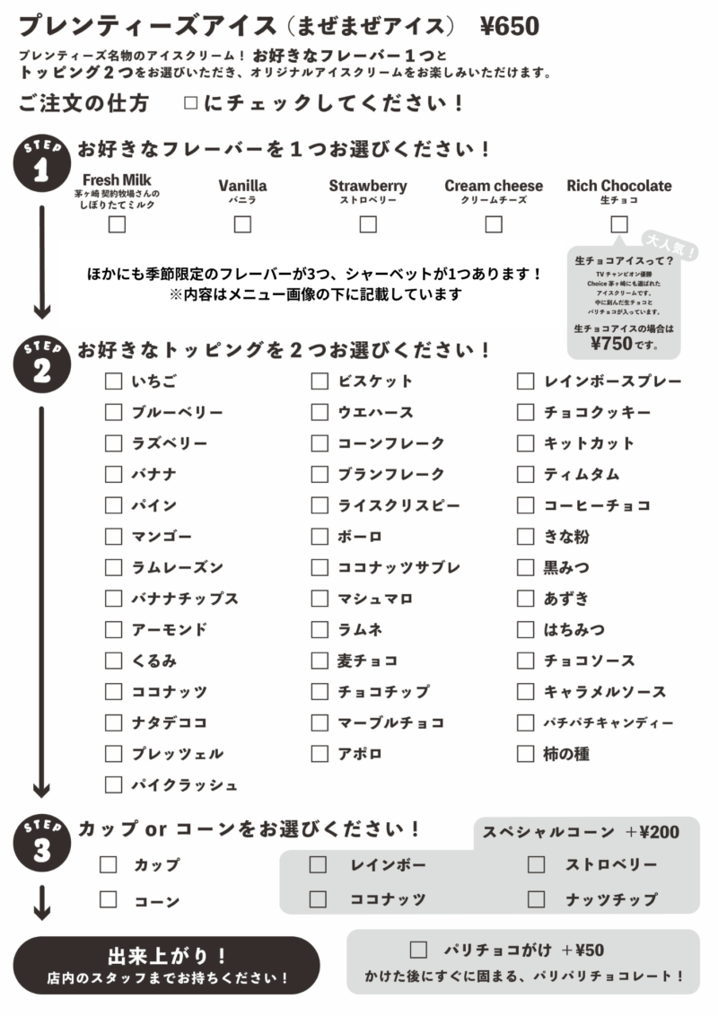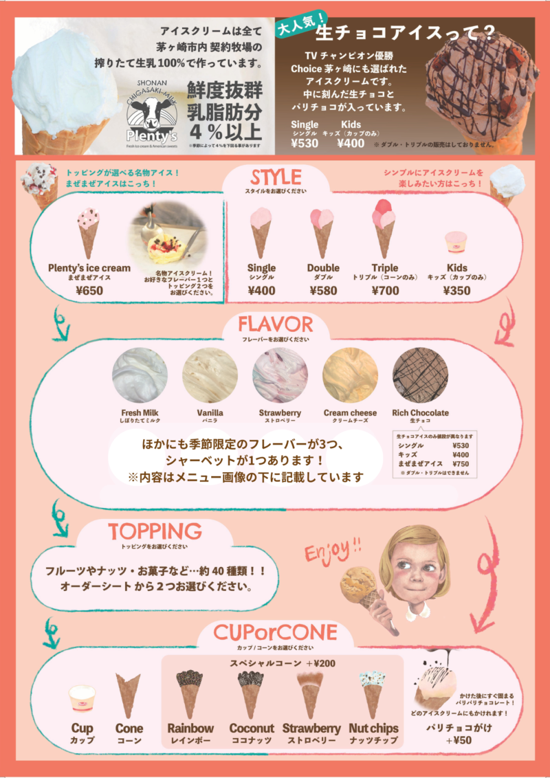 Plenty’s 茅ヶ崎本店は、湘南茅ヶ崎のアイスクリーム屋さんです。茅ヶ崎産生乳100%使用のアイスとトッピングを「まぜまぜ」するプレンティーズアイスは、地元住民から観光客まで幅広く愛されています。手焼きワッフルも大変人気です。
